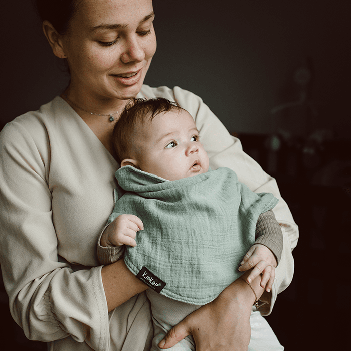 With the KipKep 3-in-1 Bib this belongs to the past! The large oval cloth covers (in the form of a kiss ) the area between your chest and your chin and the whole area of your shoulder and arm. The double layered soft and thick cotton hardly lets any moisture through, even when you get the full load.
