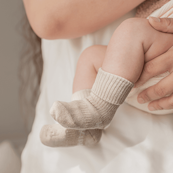 Those are the Stay-on-Socks from KipKep. Thanks to the special knitted-in “stay-on-zones,” the socks stay in place much better than other baby socks. The “stay-on-zones” are two elastic bands that are applied around the instep and above the heel, something you see a lot in sports socks as well. The socks also have a flat toe seam that does not irritate.