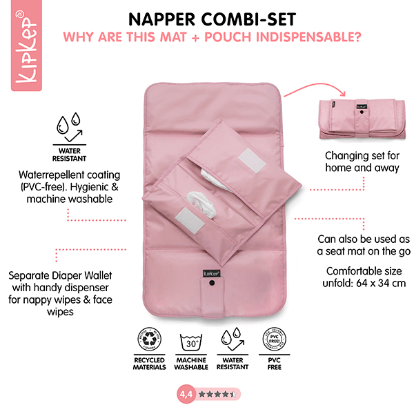 Changing nappies has never been easier. Wherever you are, no matter how dirty the nappy is: the KipKep changing mat always offers a solution. The Napper changing mat is nice and thick, so you child doesn’t feel anything of the surface below. At the same time, it feels soft and is easy to clean. The mat is even machine-washable! You simply put it like this – with a nappy wallet – in your bag.