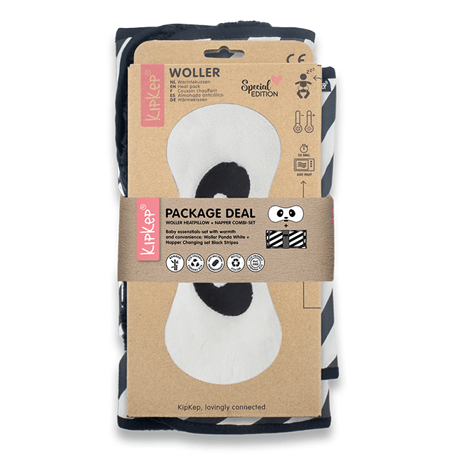 The Woller Panda White (cover made from sustainable bamboo fleece) helps your baby relax when they are restless or have stomach ache, while the Napper Combi-Set Black Stripes (made from recycled fabrics) makes changing diapers easy and stylish, wherever you are.